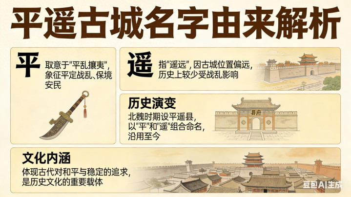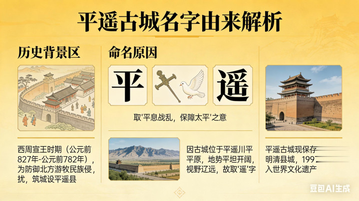 更名后不久,因战乱与西羌内侵,平遥县治东迁于今平遥京陵村一带,废京陵县并入平遥,古城也随之迁于今址 。从此,“平遥”之名固定下来,历经隋唐、宋元、明清,再未编削 。明洪武三年(1370年),古城重筑扩建,包砖加固、增设城楼,冉冉变成当天“龟城”时势。明清晋商崛起,平遥票号汇通天地,“平”的平定、“遥”的邃晓,恰与“汇通天地”的买卖精神相契。