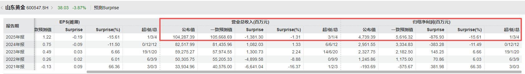 据Wind金融末端汇编的数据,4家参与瞻望的机构对山东黄金2025年归母净利润的一致瞻望值约为56.16亿元。因此,按照公司败露的47.39亿元的数据来看,公司功绩不足部分机构预期。