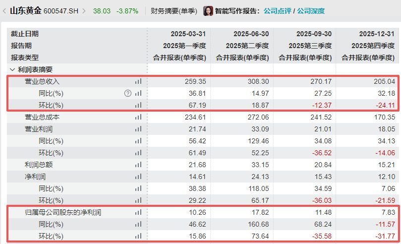 纵向来看,1042.87亿元的营收和47.39亿元的归母净利润均创山东黄金单年新高,且营收初次在单年内上破千亿大关。不外,分季度来看,山东黄金2025年第四季度的营收和归母净利润均录得环比的下滑:营收环比下滑24.11%至205.04亿元、归母净利润环比下滑31.77%至7.83亿元。